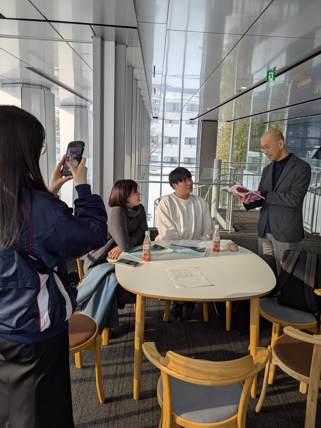 お二人の卒業後の進路ですが、Мさんは、チェコのプラハ芸術アカデミーに進学し写真の勉強を、Sさんは、北星4大の英文学科へ編入学が決まると同時に、アイルランド国立大学コーク校への第1期派遣留学生に選出され、派遣留学することが決まっております。お二人の今後の益々の活躍が楽しみです。(写真は、企画広報課の取材風景です)