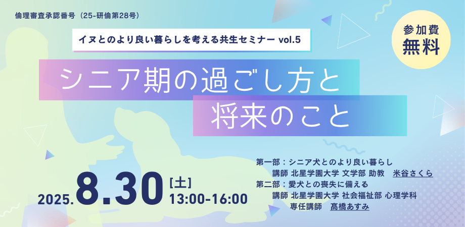 - 【8/30(土)開催オンラインセミナー】イヌとのより良い暮らしを考える共生セミナー vol.5 ~シニア期の過ごし方と将来のこと~2025.08.18