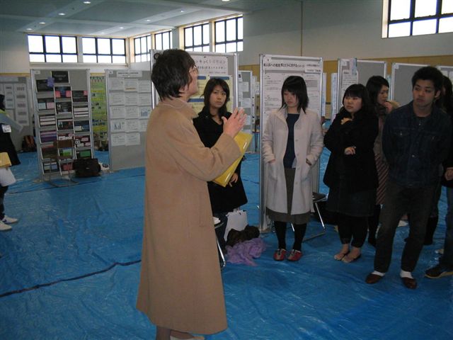 心理・応用コミュニケーション学科では,ゼミでの卒研発表の他に,全体発表会も行っています。自分で作成したポスターの前に立ち,質疑応答をします(90分2交代制)。また,午後には映像作品を上映します。