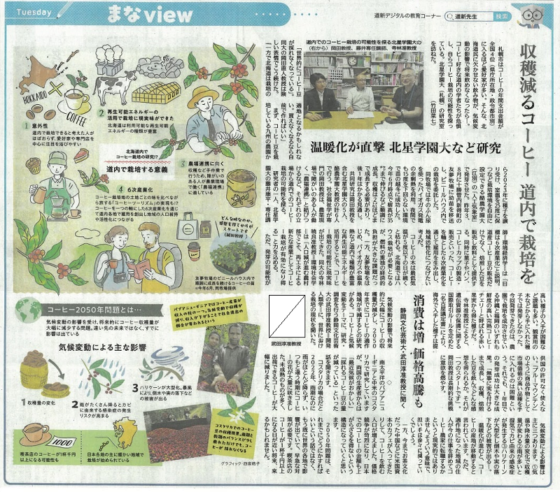 本学教員らによる、道内におけるコーヒー栽培の研究に関する記事が7月8日付の北海道新聞に掲載されました。