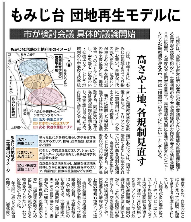 札幌市は厚別区内もみじ台地域の再編整備に関する検討会議を団地再生のモデルにするべくこの6月に設置し、鈴木教授が座長に就任しました。今後、土地利用再編について議論することとなっています。