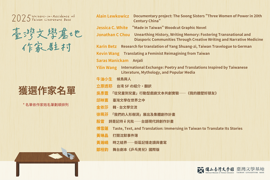 国立台湾文学館が全世界に向けて公募している滞在型企画「2025 臺灣文學基地作家駐村(2025 台湾文芸基地 ライター・イン・レジデンス)」に、本学文学部 山本 範子 教授が、筆名である立原 透耶として選出されました。