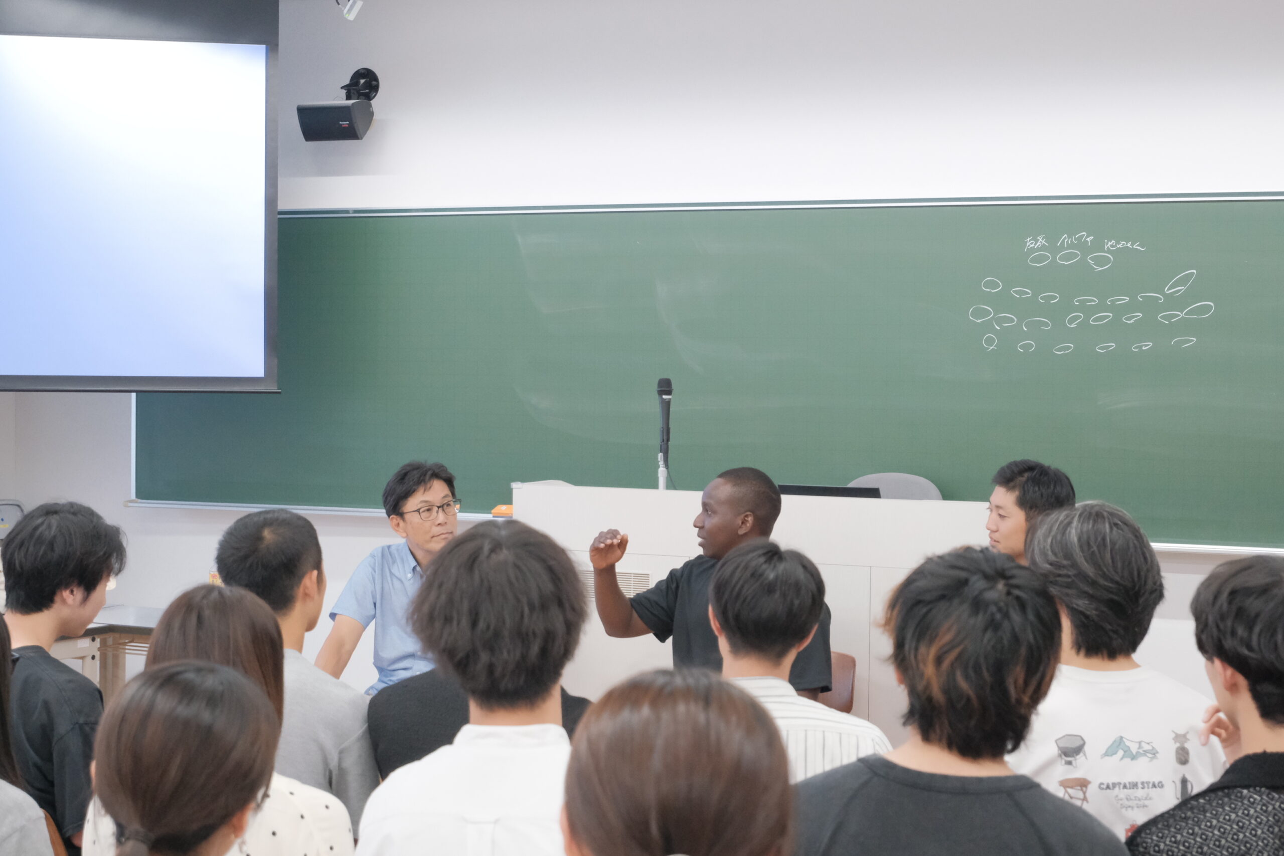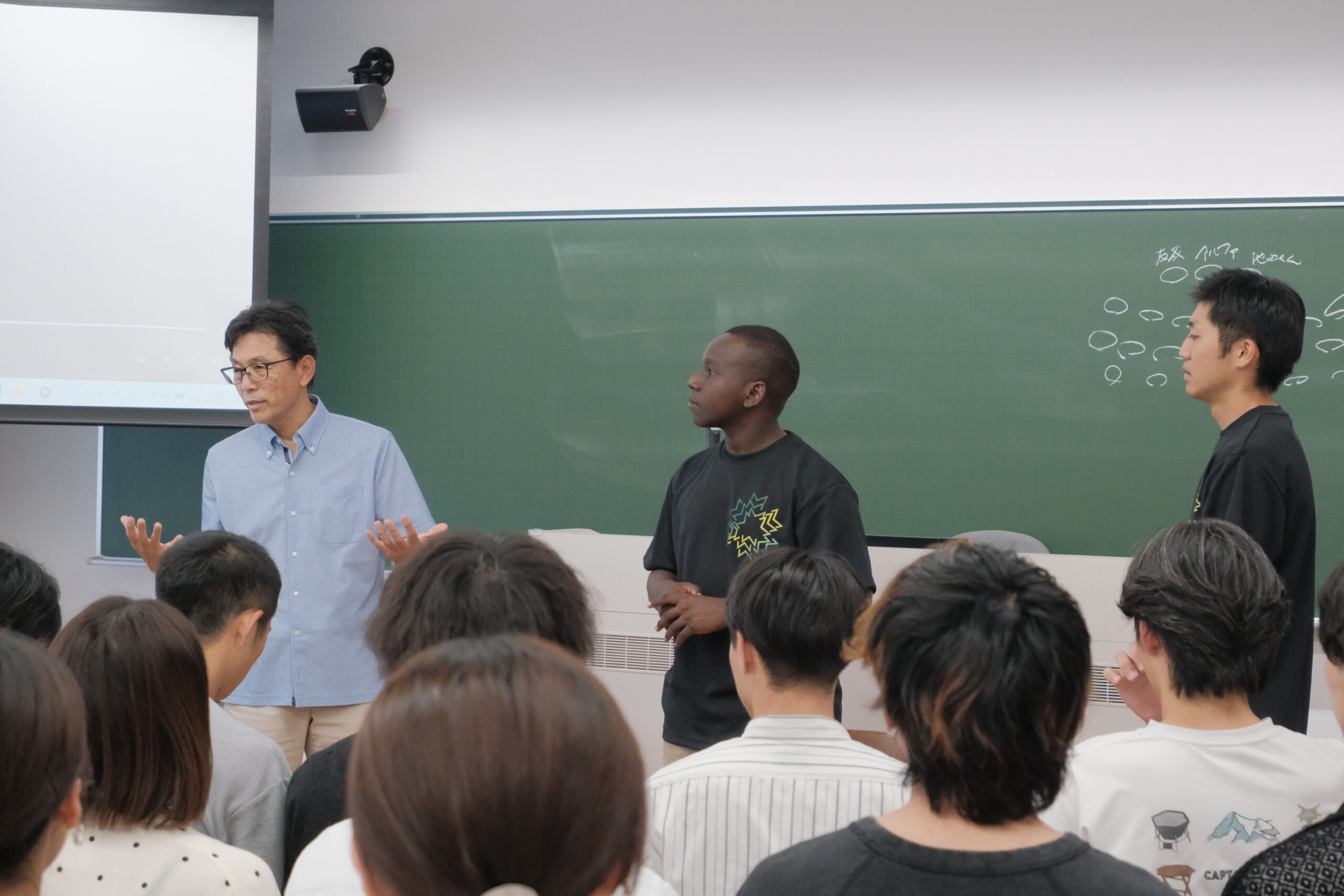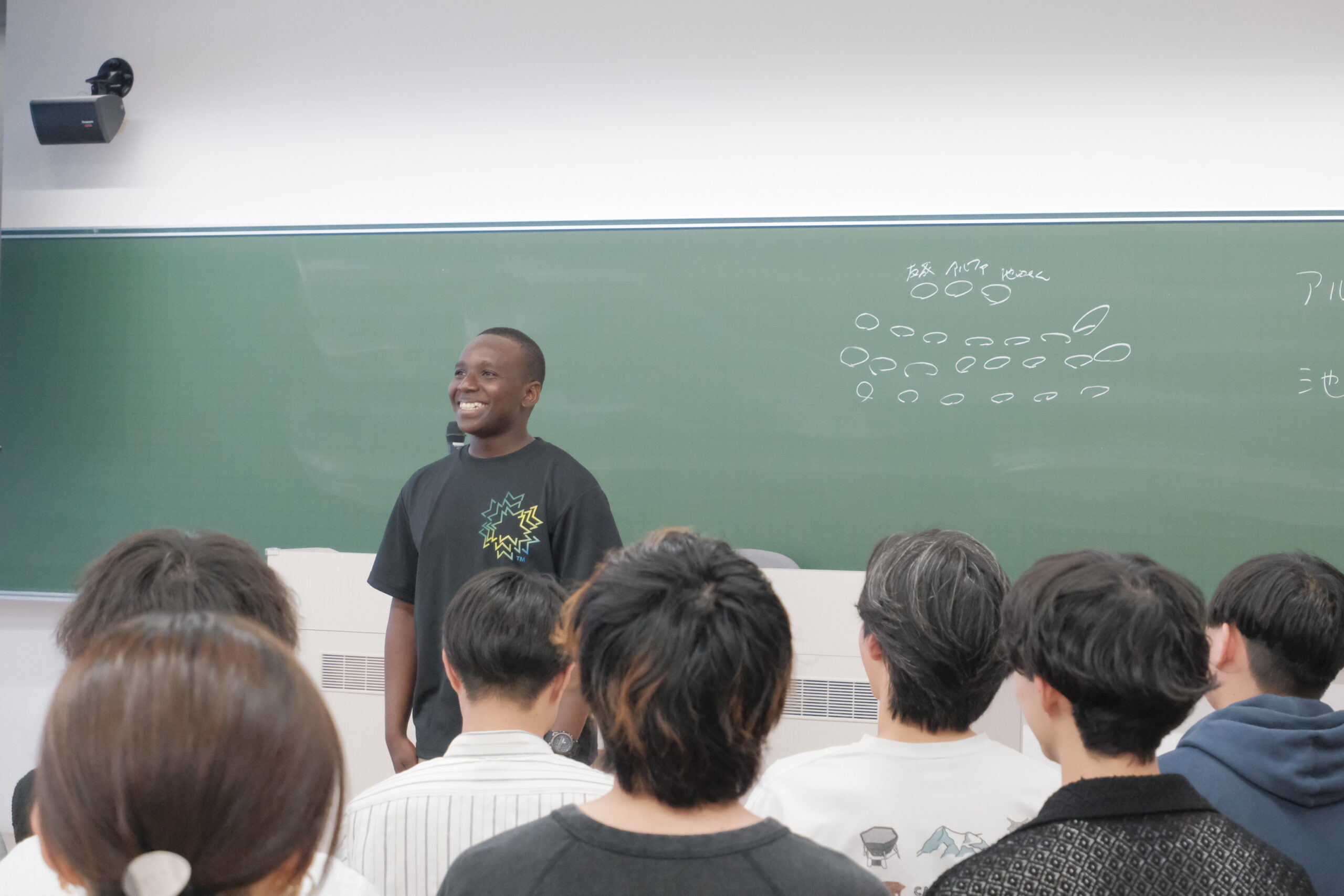 6月25日(火)、「国際交流特別講義K」の授業で、「アフリカに甲子園を!」と題して、一般財団法人アフリカ野球・ソフト振興機構(J-ABS)代表理事の友成晋也氏を特別講師としてお招きしました。今回は、タンザニアから北海道札幌南高等学校に留学中のアルファ君、そして北海道札幌南高等学校野球部の池田コーチにもご参加いただきました。