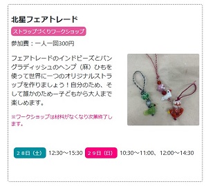 フェアトレードに関わる北海道内外の23店舗・団体が出展し、フェアトレード商品の紹介と販売を行い、本学学生サークル・北星フェアトレードも、ベトナム、バングラデシュの生産者と連携したオリジナルなフェアトレード商品の販売とインド・バングラデシュのビーズと紐を使ったフェアトレードストラップづくりのワークショップを行います。