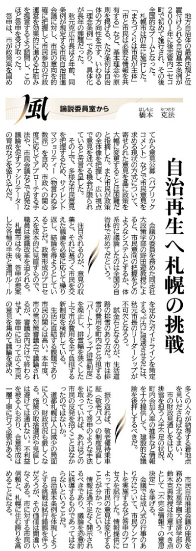 <風・論説委員室から>と題されたコラムにおいて、鈴木教授は札幌市の第5次市民自治推進会議座長として、市民参加型の行政運営を進める上での注意点についてコメントしています。